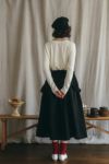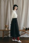 身長153㎝ 「シンプルな薄手のニットを合わせて、スカートを主役にしたコーディネートにしました。トップスがシンプルでも簡単にコーディネートが完成するので、つい手に取ってしまうアイテムになりそうです。調節可能なストラップは、今回は中間の位置でとめました。短すぎず長すぎない足首くらいのちょうどいい丈です。革靴を合わせてクラシックなイメージでも、スニーカーでカジュアルにしてもよさそう!」