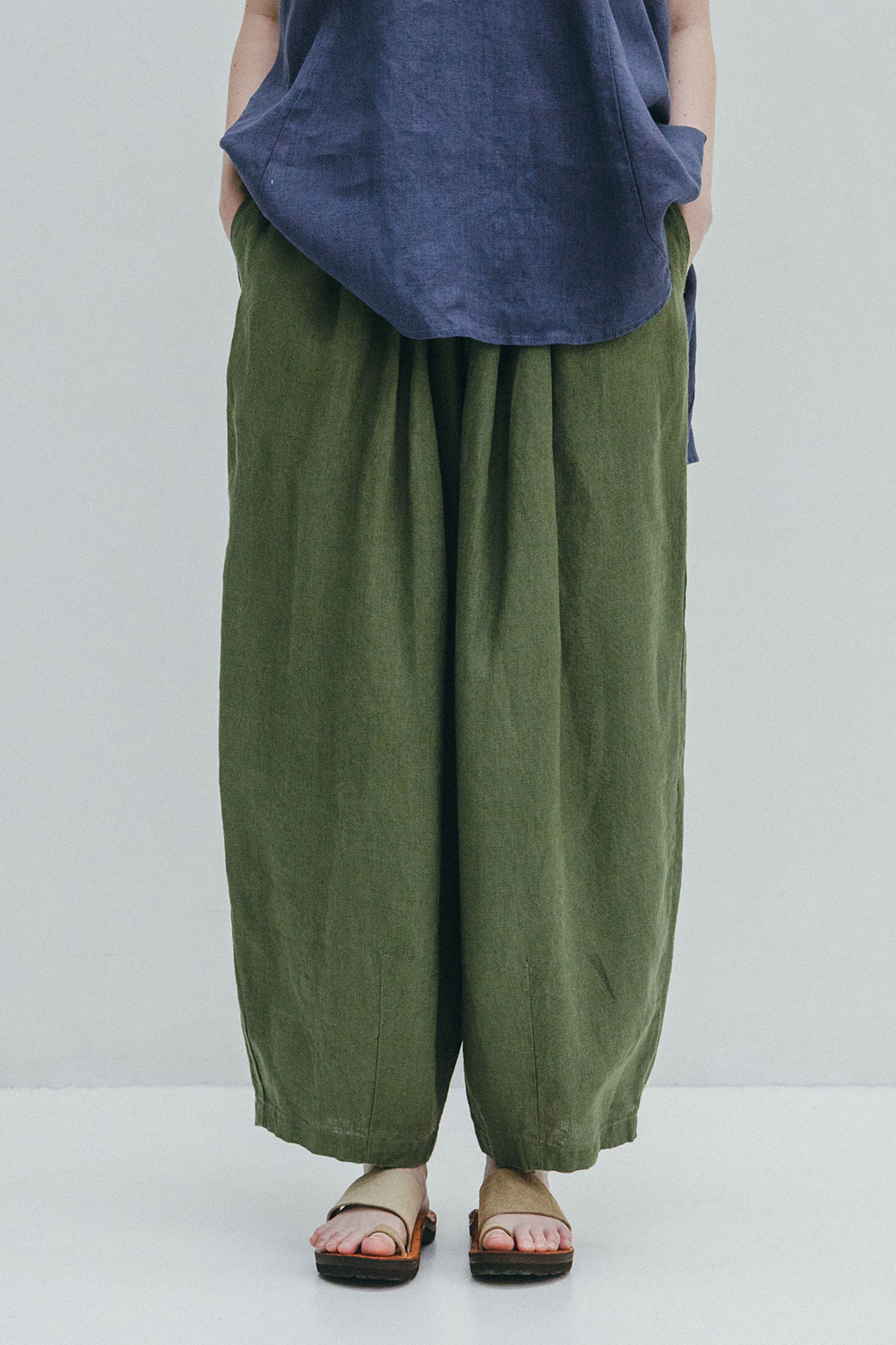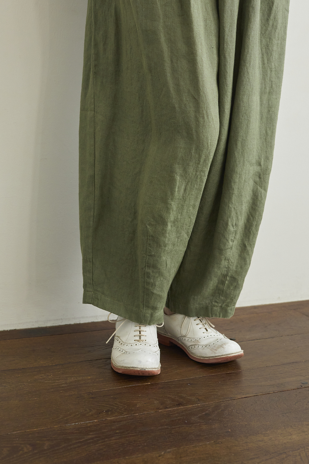 フロントにはタックを施し、股上を深くとることで、ほどよいボリュームと安心感のあるデザインに。
