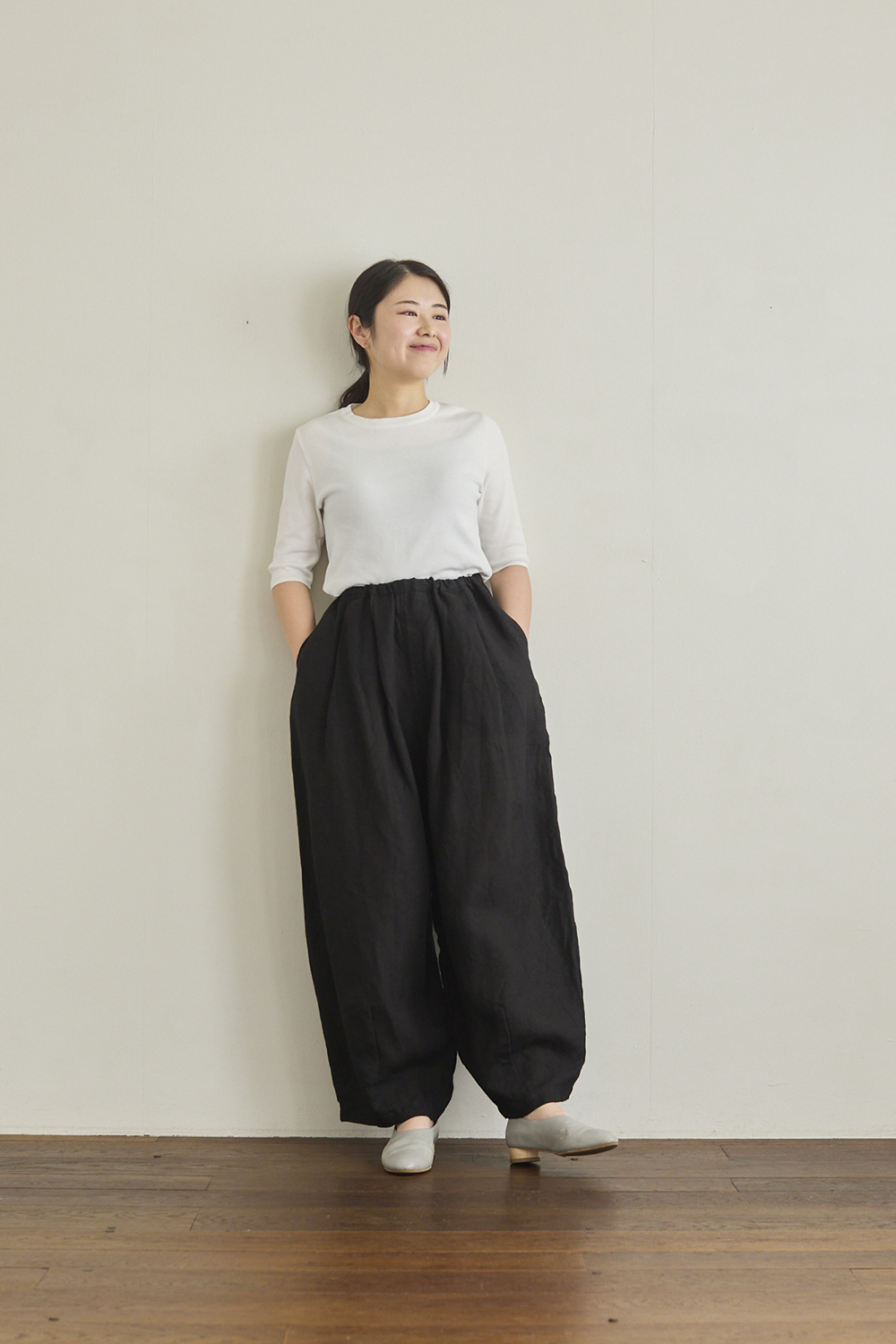 右:身長160㎝ 「さっと履くだけでおしゃれなバランスにしてくれるパンツです。体のラインを拾わないのでなにも気にせず履けるのも嬉しいですね。マギー トップを合わせて女性らしさをプラスしました」