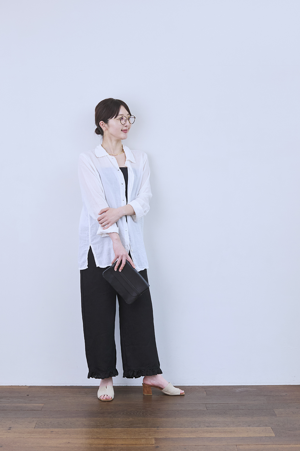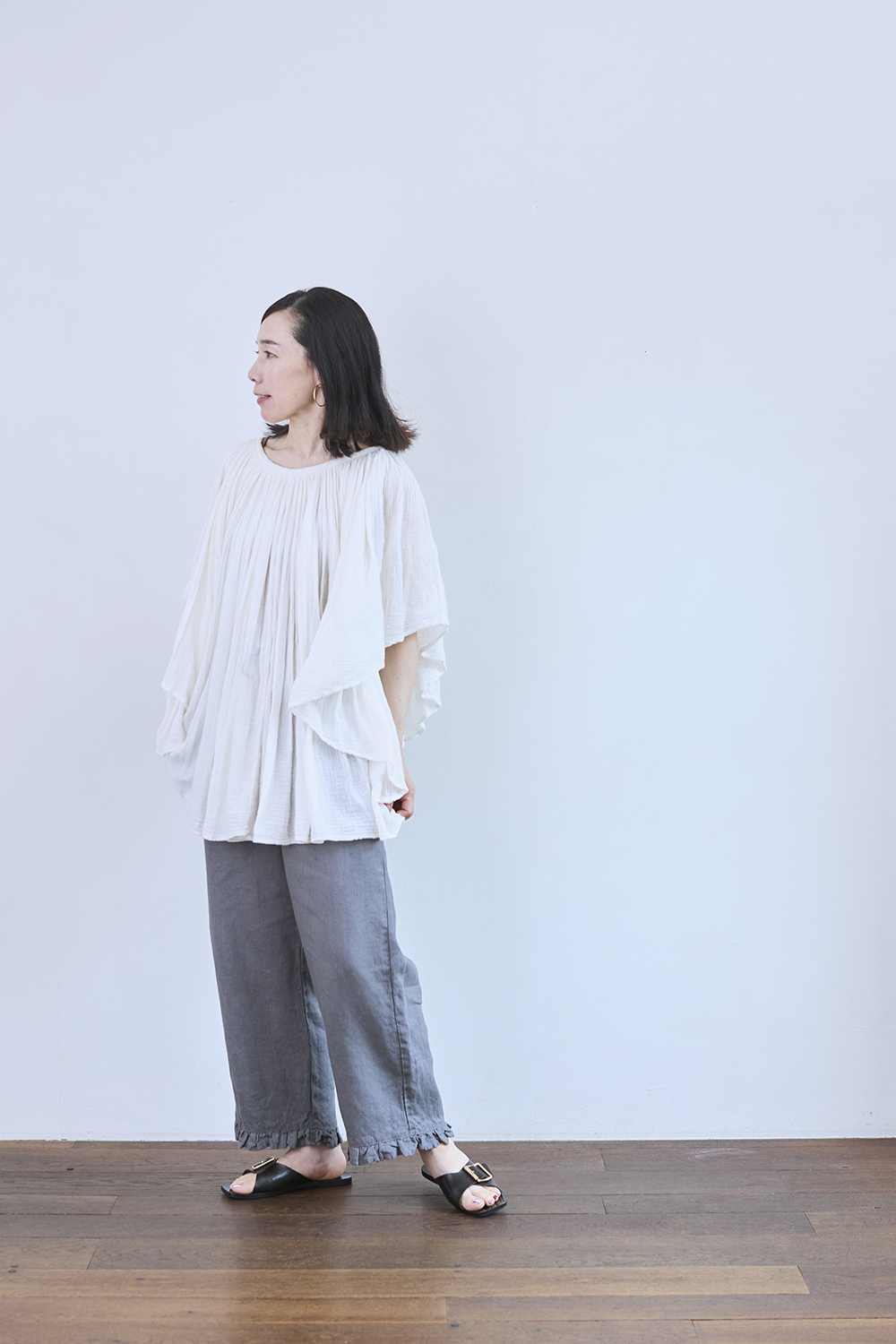 身長161㎝「ふんわりとしたトップスを合わせてリラックス感のあるスタイルに。裾のフリルが、シンプルなコーディネートのアクセントになります。足元はサンダルで抜け感を出して、気軽に楽しめる雰囲気にしてみました」