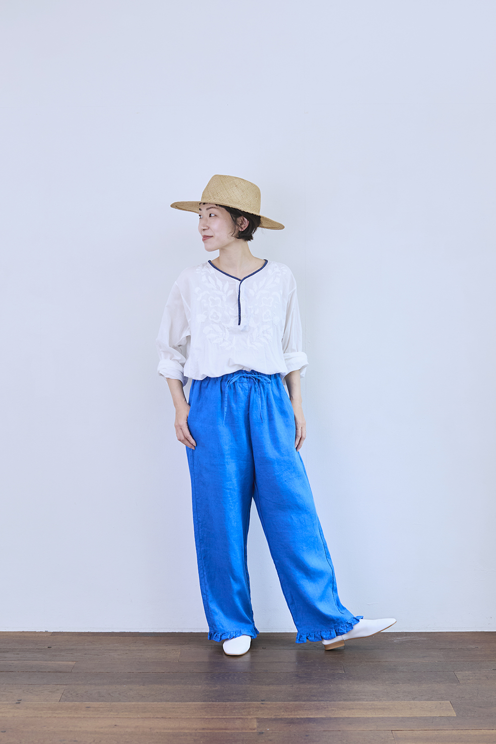 右:身長153㎝「鮮やかなブルーのパンツはコーディネートの主役になる1本。麦わら帽子と合わせて、夏のお出かけに履きたいです。ウエストで履く位置を調整できるので、わたしの身長でも、ペタンコな靴と合わせて履けます」