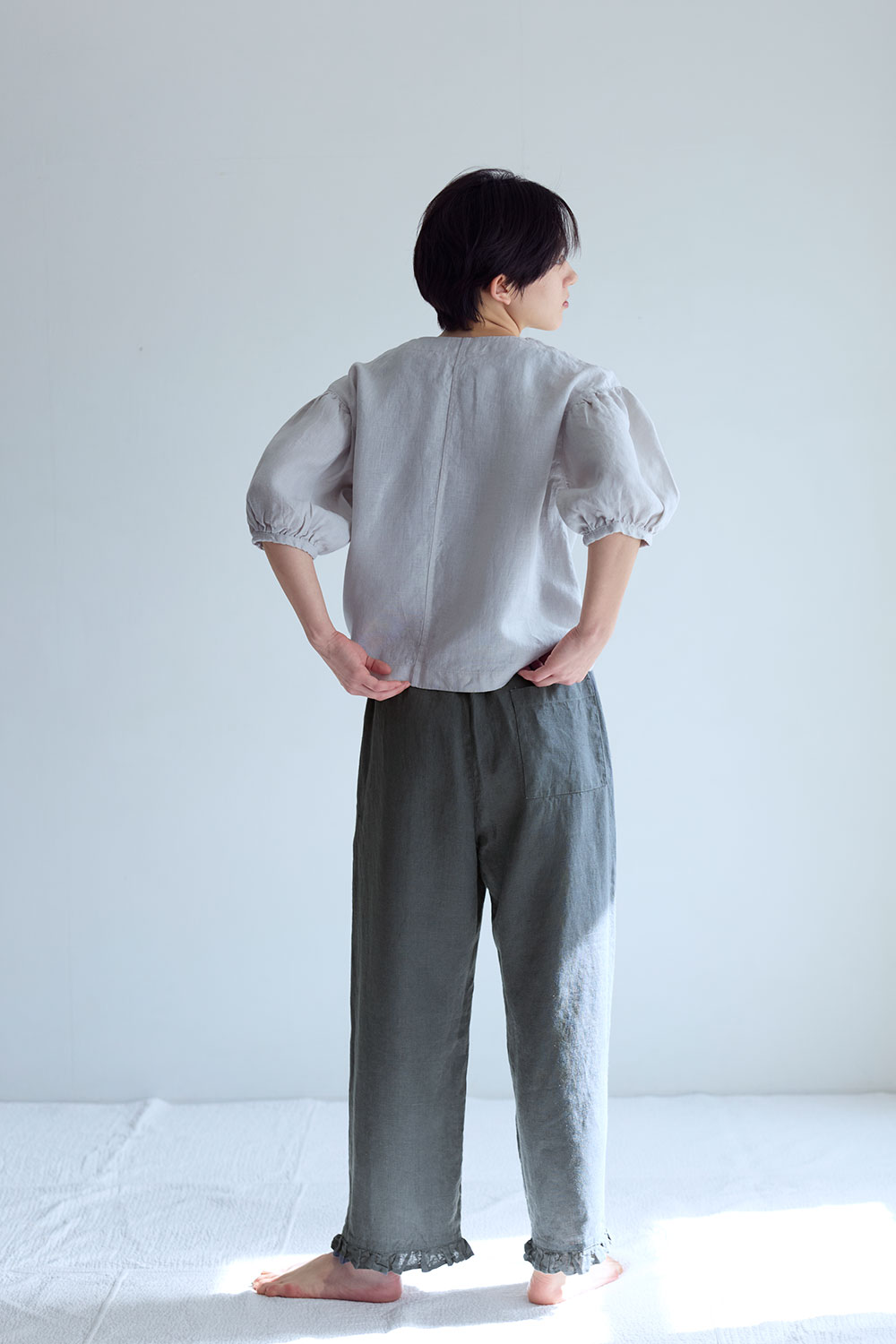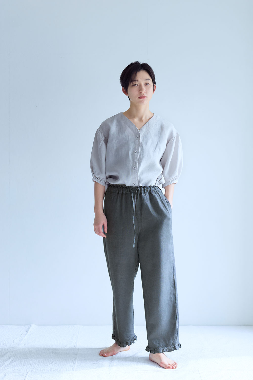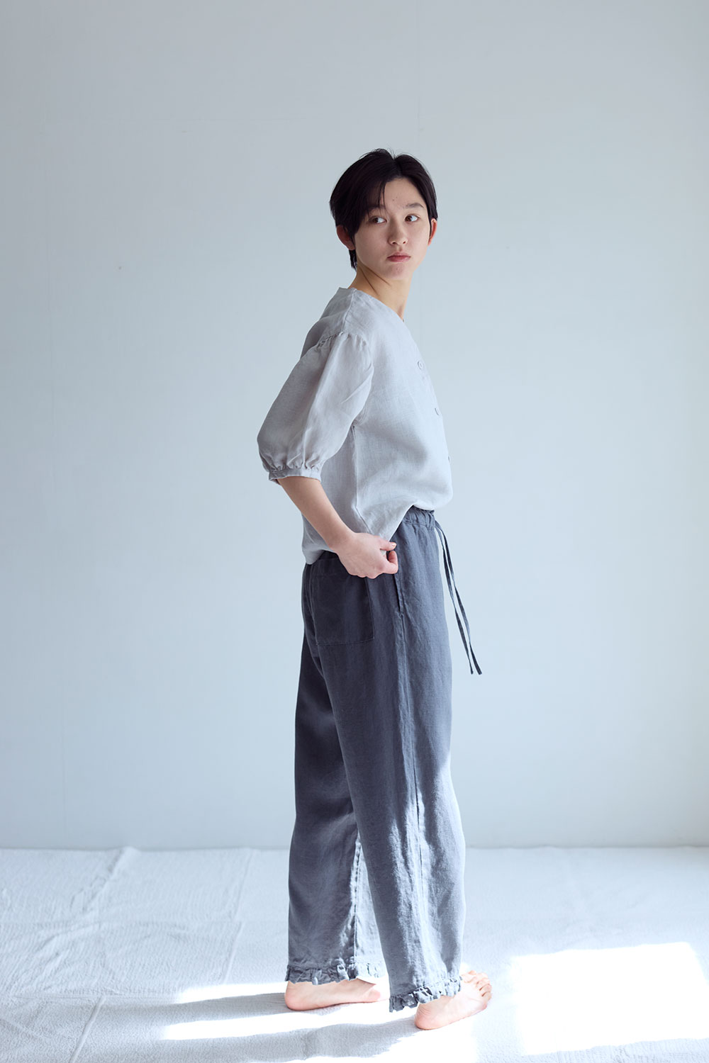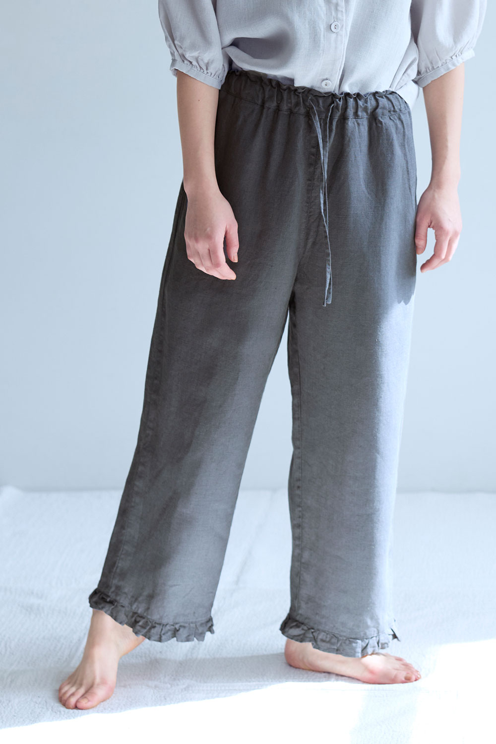 程よい厚みの普通地リネン生地で仕立てたイージーパンツ。