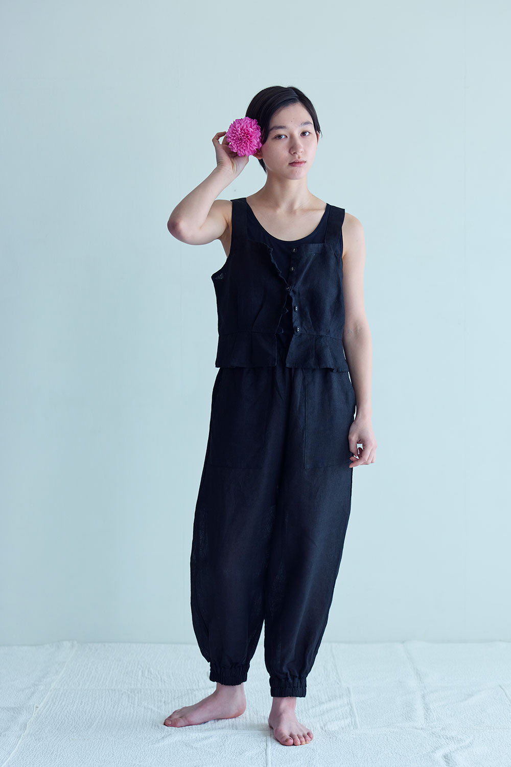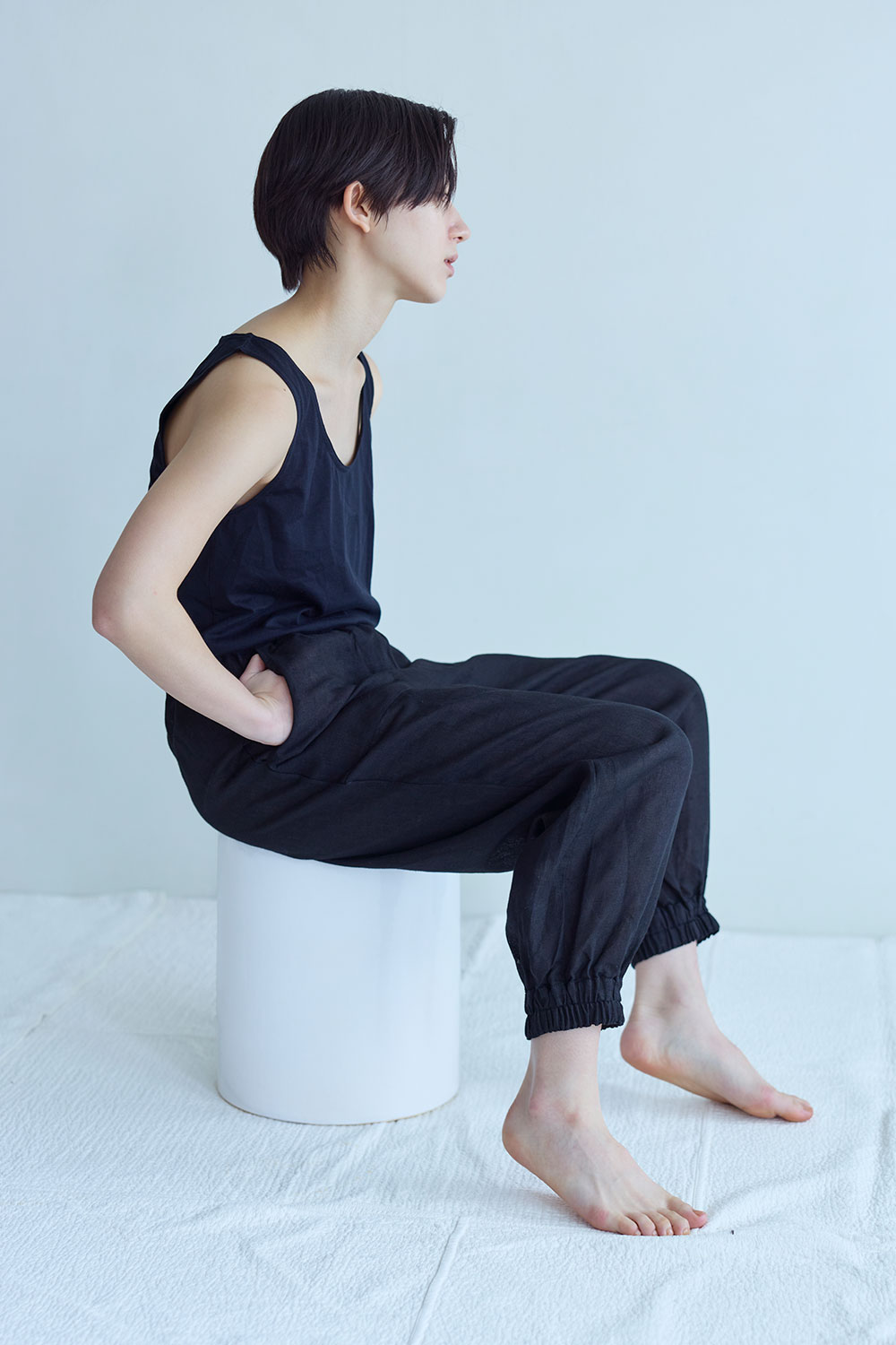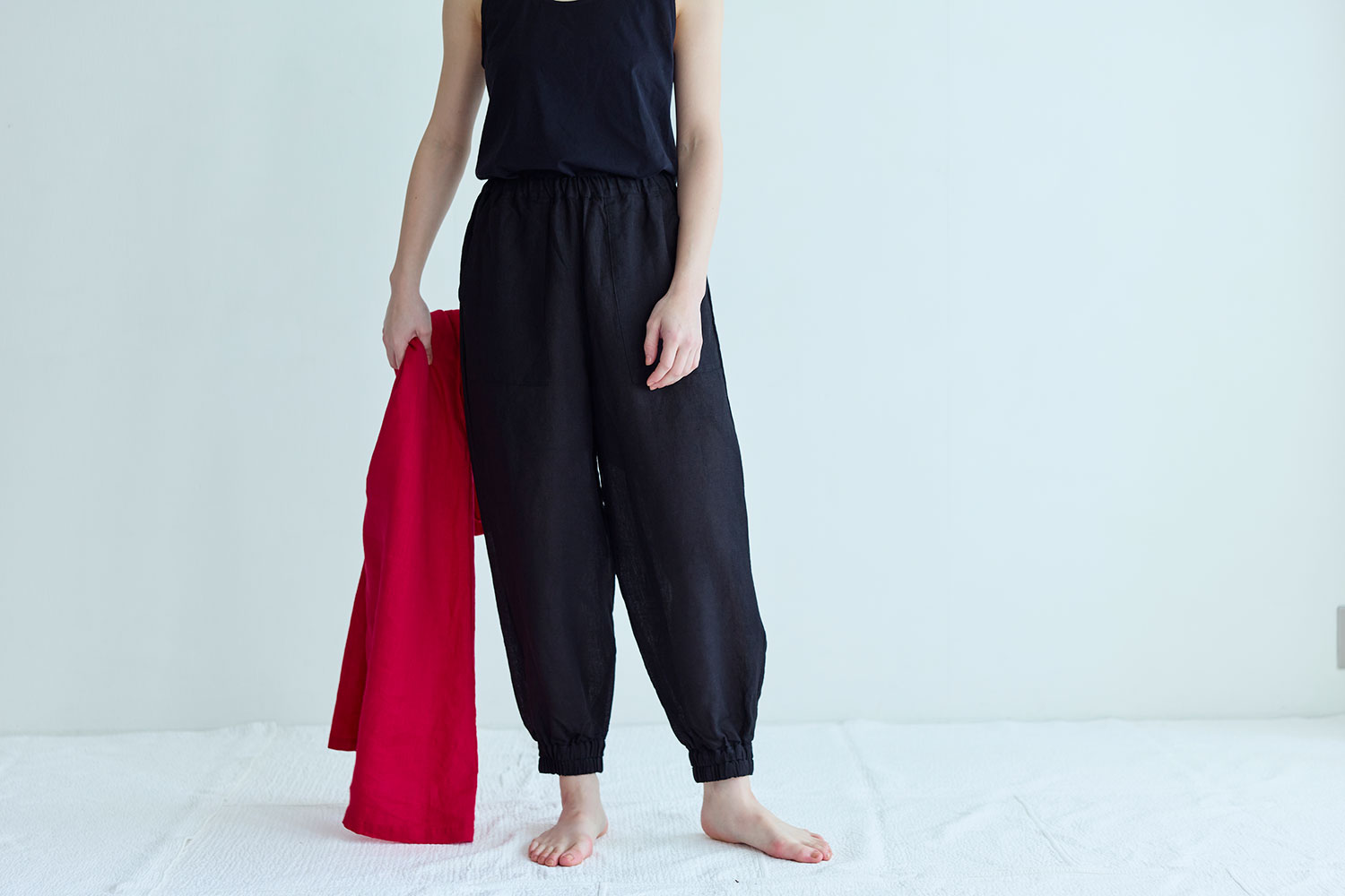 裾にゴムを入れ、丸みのあるすぼまったシルエットに仕立てたパンツ。