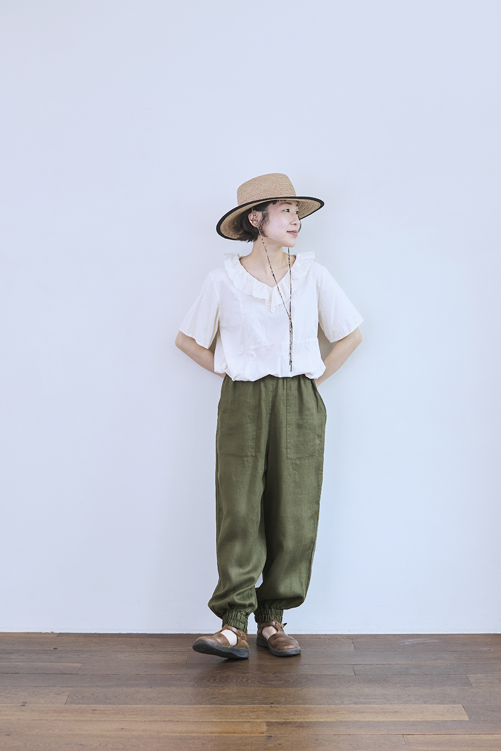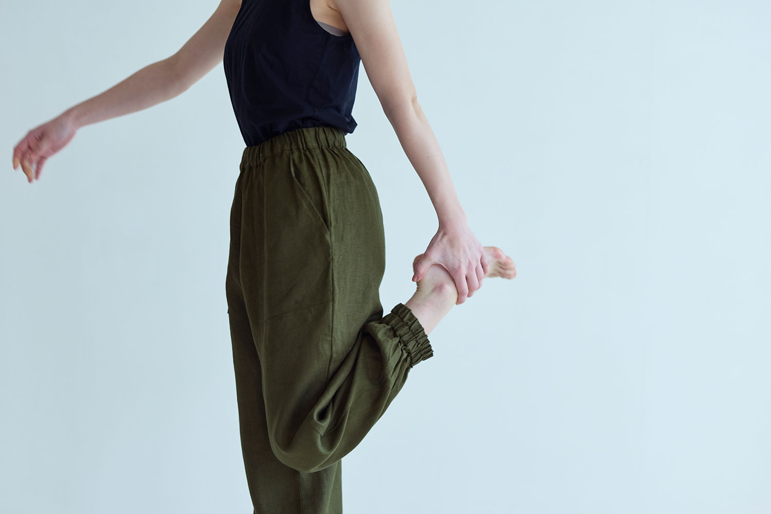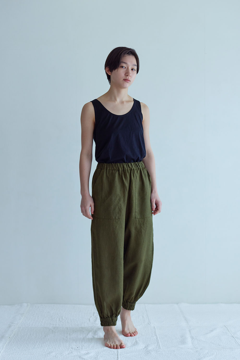 裾にゴムを入れ、丸みのあるすぼまったシルエットに仕立てたパンツ。