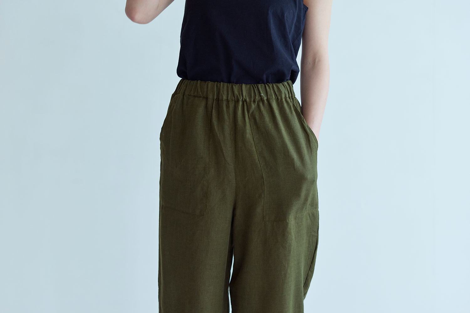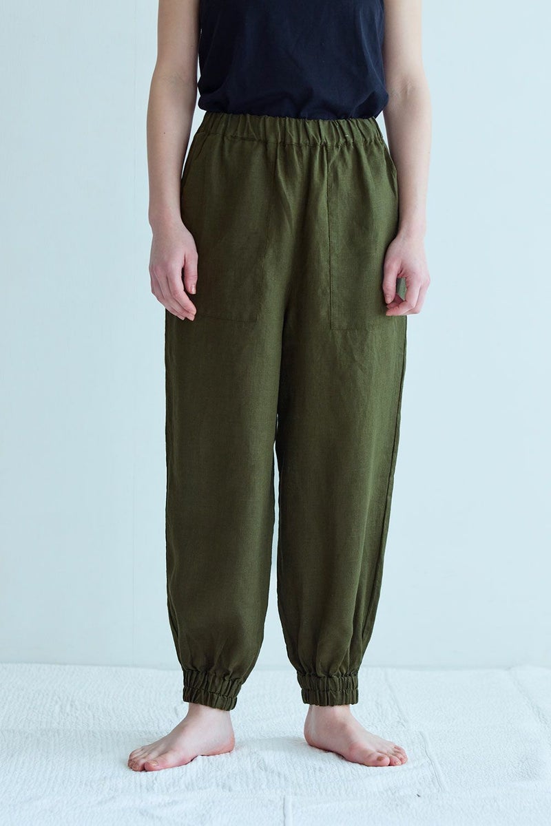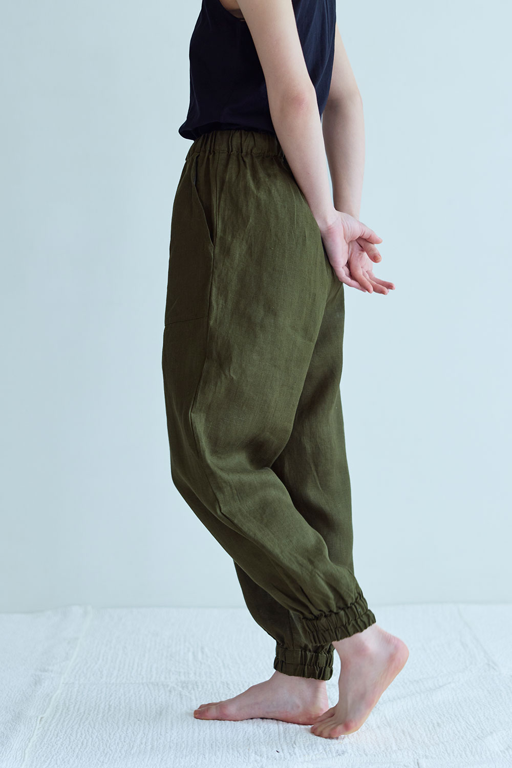 裾にゴムを入れ、丸みのあるすぼまったシルエットに仕立てたパンツ。