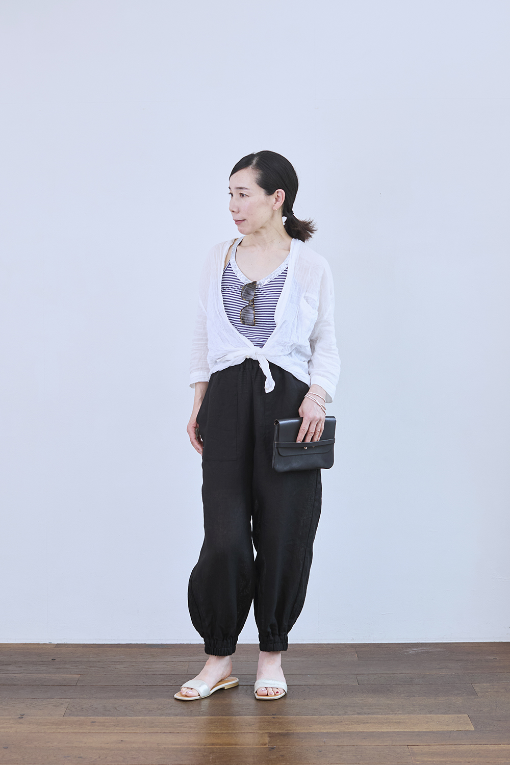 右:身長162㎝「さっと履くだけでおしゃれなバランスにしてくれるパンツですね。体のラインを拾わないのでなにも気にせず履けるのも嬉しい。カジュアルなアイテムなので、サンダルとクラッチバッグを合わせて、大人っぽさをプラスしました」