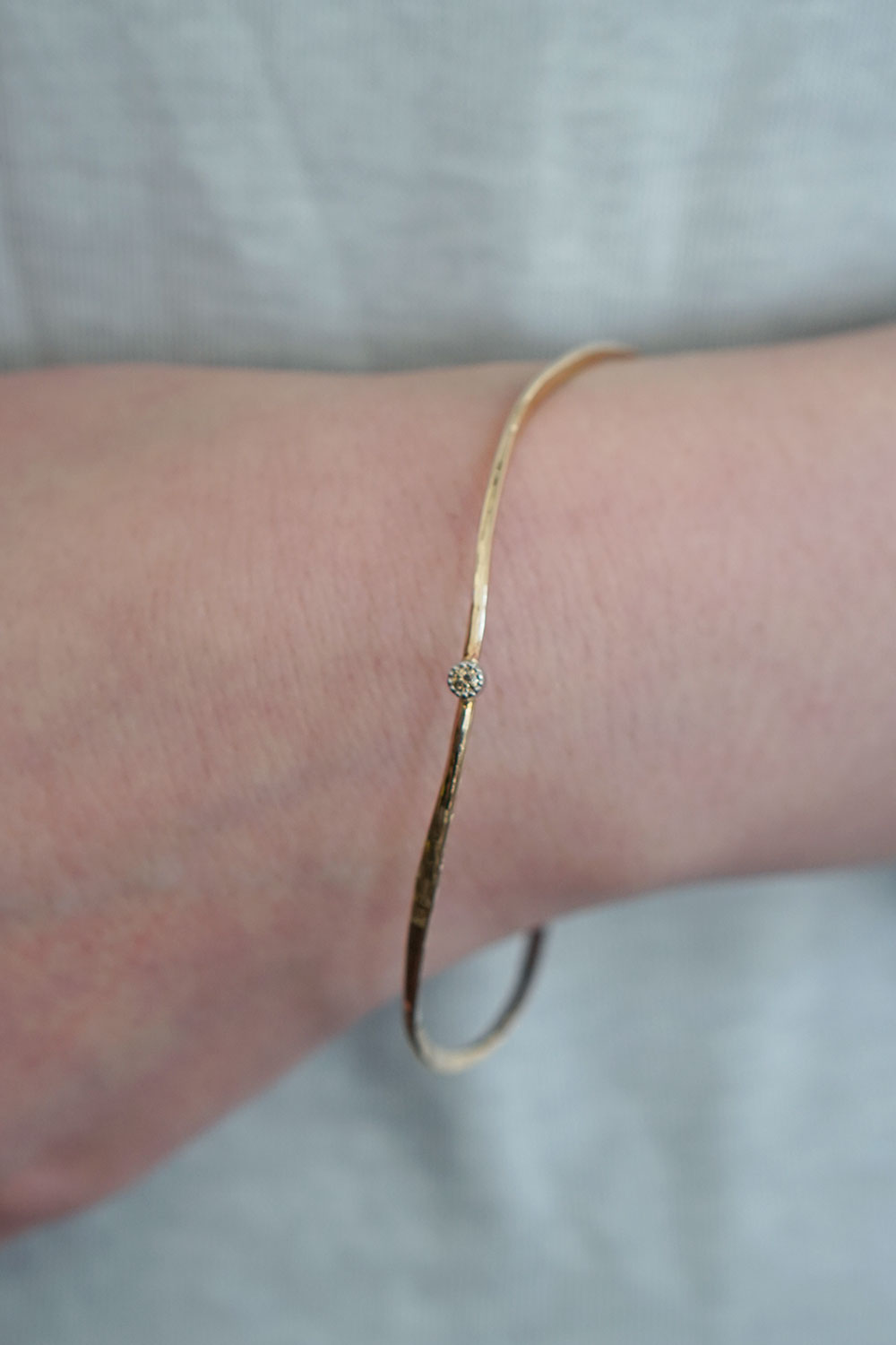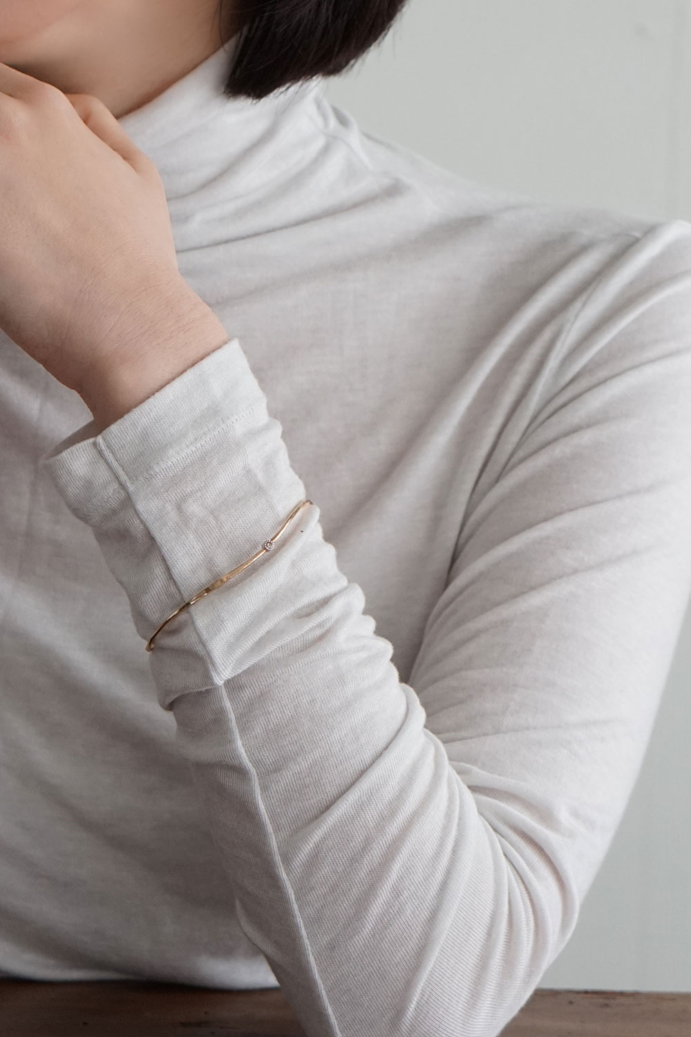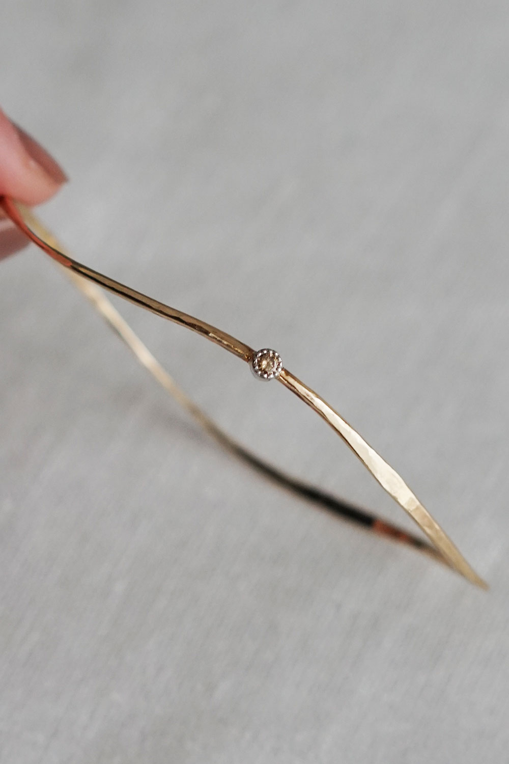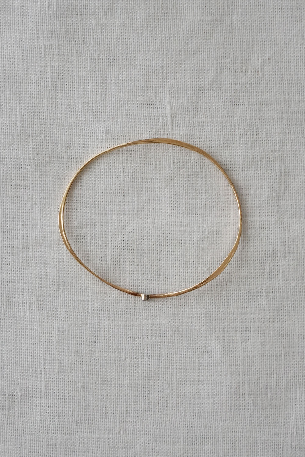 温もりを感じる均一でない質感と美しい曲線で、一本で存在感があり、装いを選ばず長く愛用していただけるバングルです。
