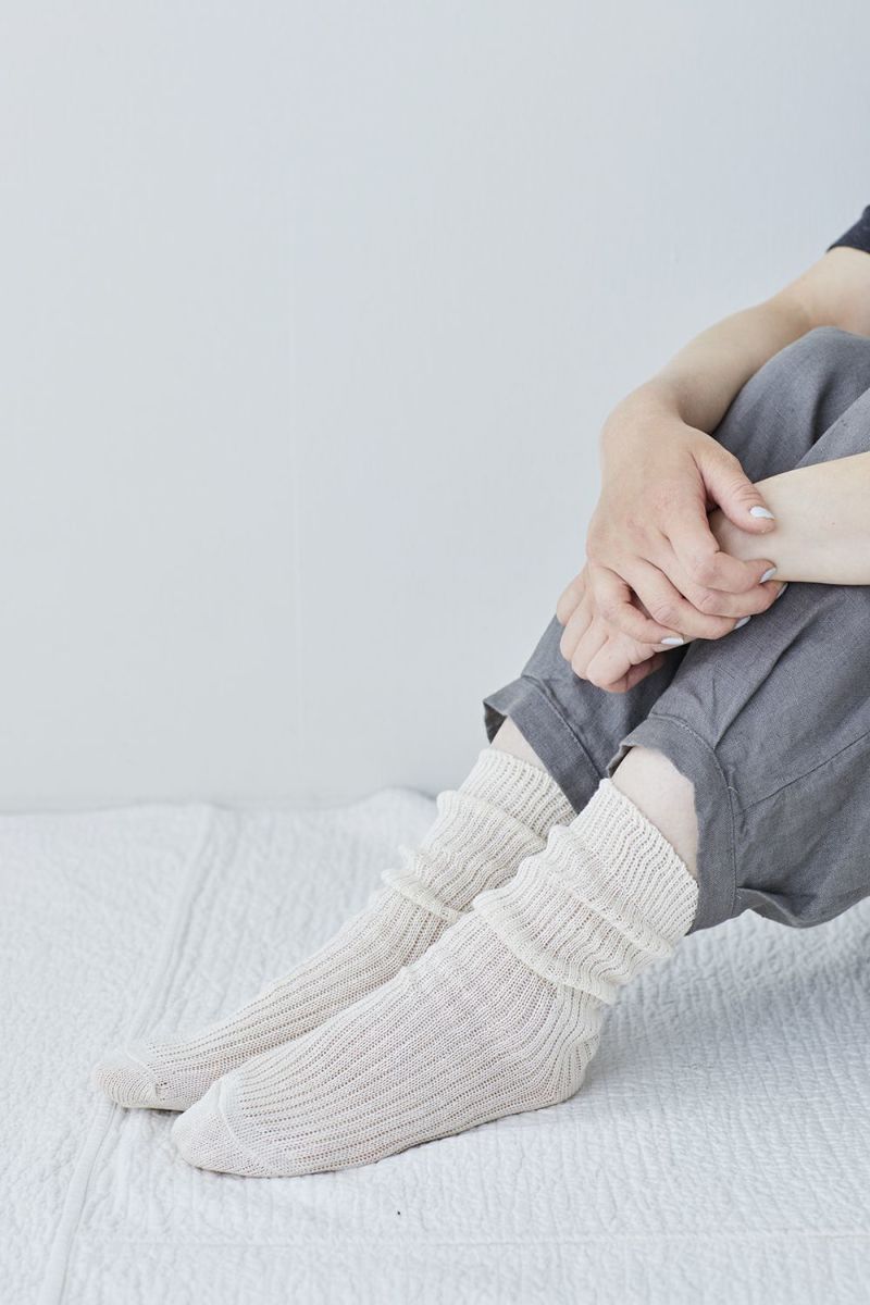 ミドルゲージで編んだリネン素材のリブソックス。程よいフィット感でリラックスした履き心地です。