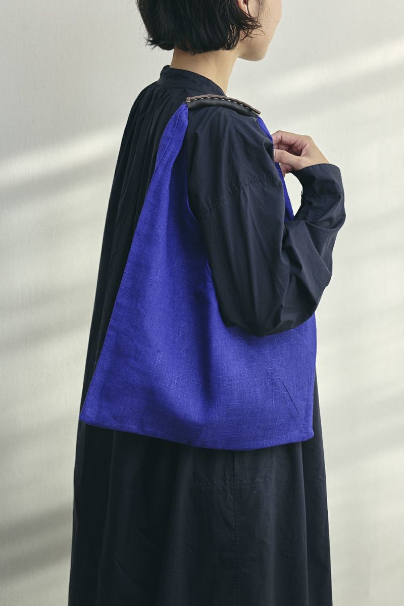 厚地のリネン生地で仕立てた、あずま袋のようなデザインのバッグ。