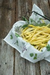 さまざまな種類のハーブが描かれたハンカチ。小さくハーブの名前も書かれています。