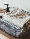 太めのリネン糸でざっくりと織った、厚手のシャンブレー生地でバスタオルを仕立てました。