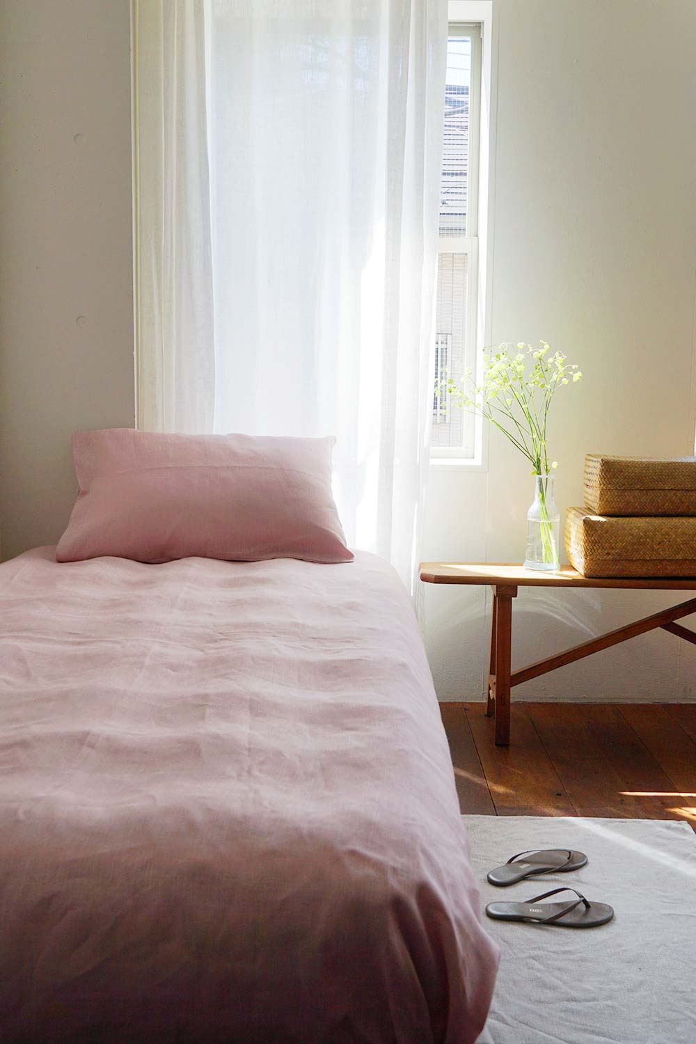春夏はさらっとした肌触りで気持ちよく、リネン繊維の中は空洞構造になっているため空気を多く含み、一度温まるとその暖かさを保ちます。秋冬も心地よくお使いいただけるので、季節を問わず一年中活躍します。