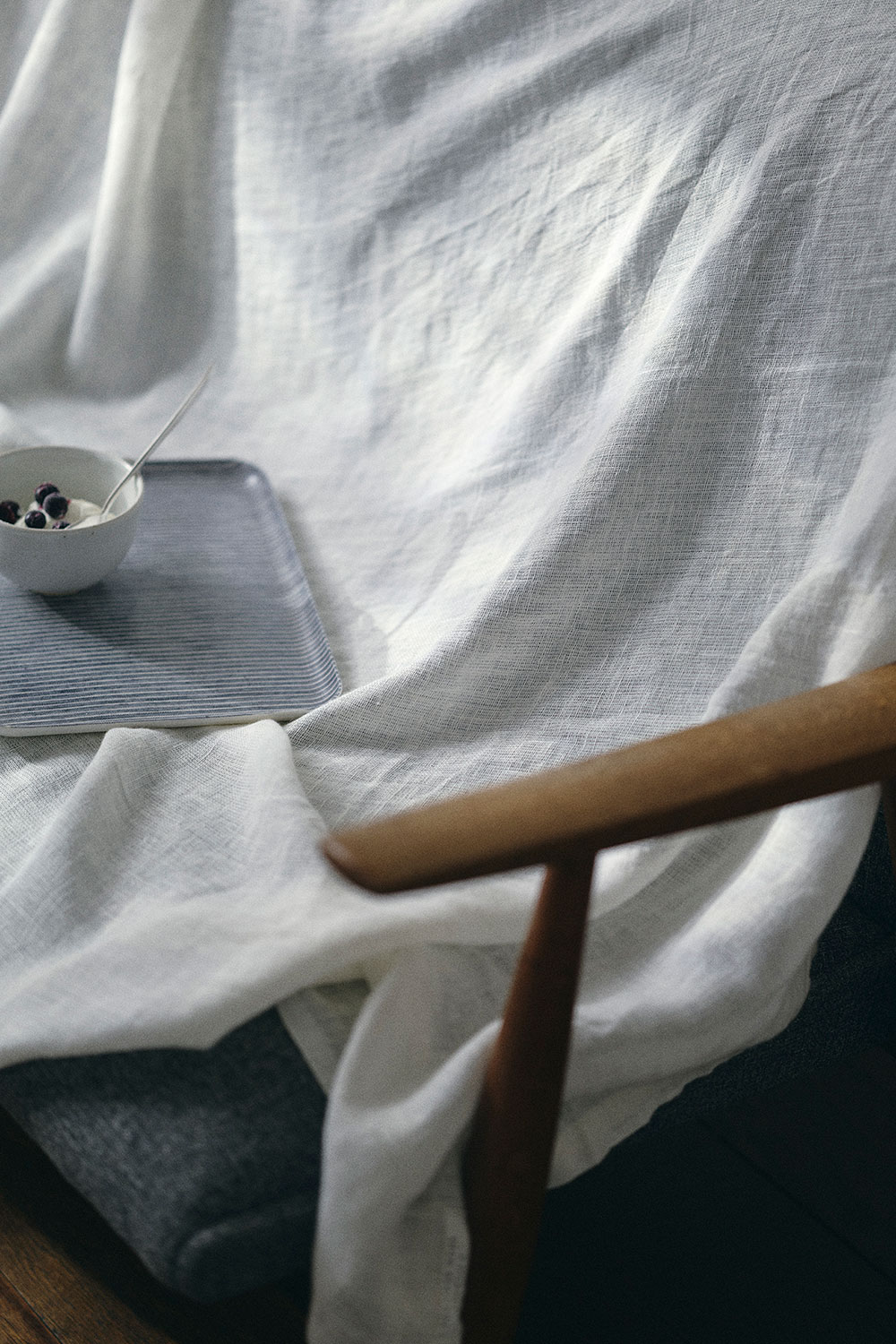 普通地よりも少し網目を大きく織ったガーゼのような柔らかなリネン生地をブランケットに仕立てました。