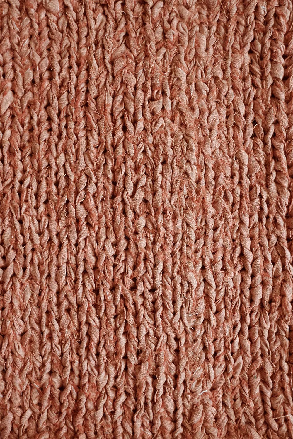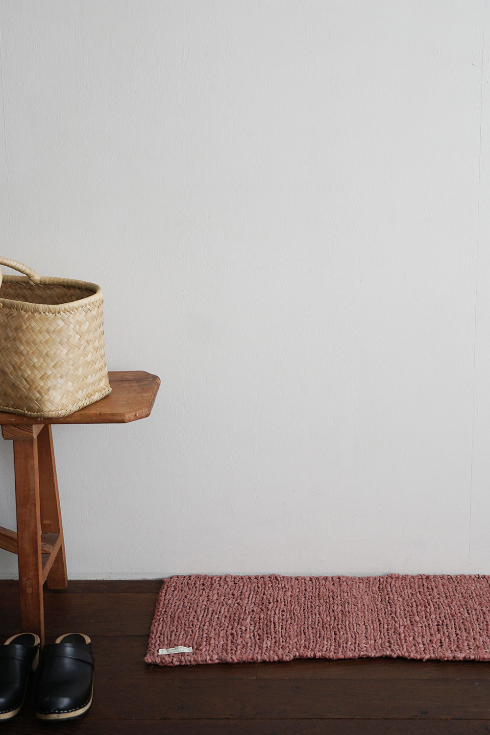 リネン製品のはぎれを使用して編んだニットマット。ざっくりとした厚みのある編地です。