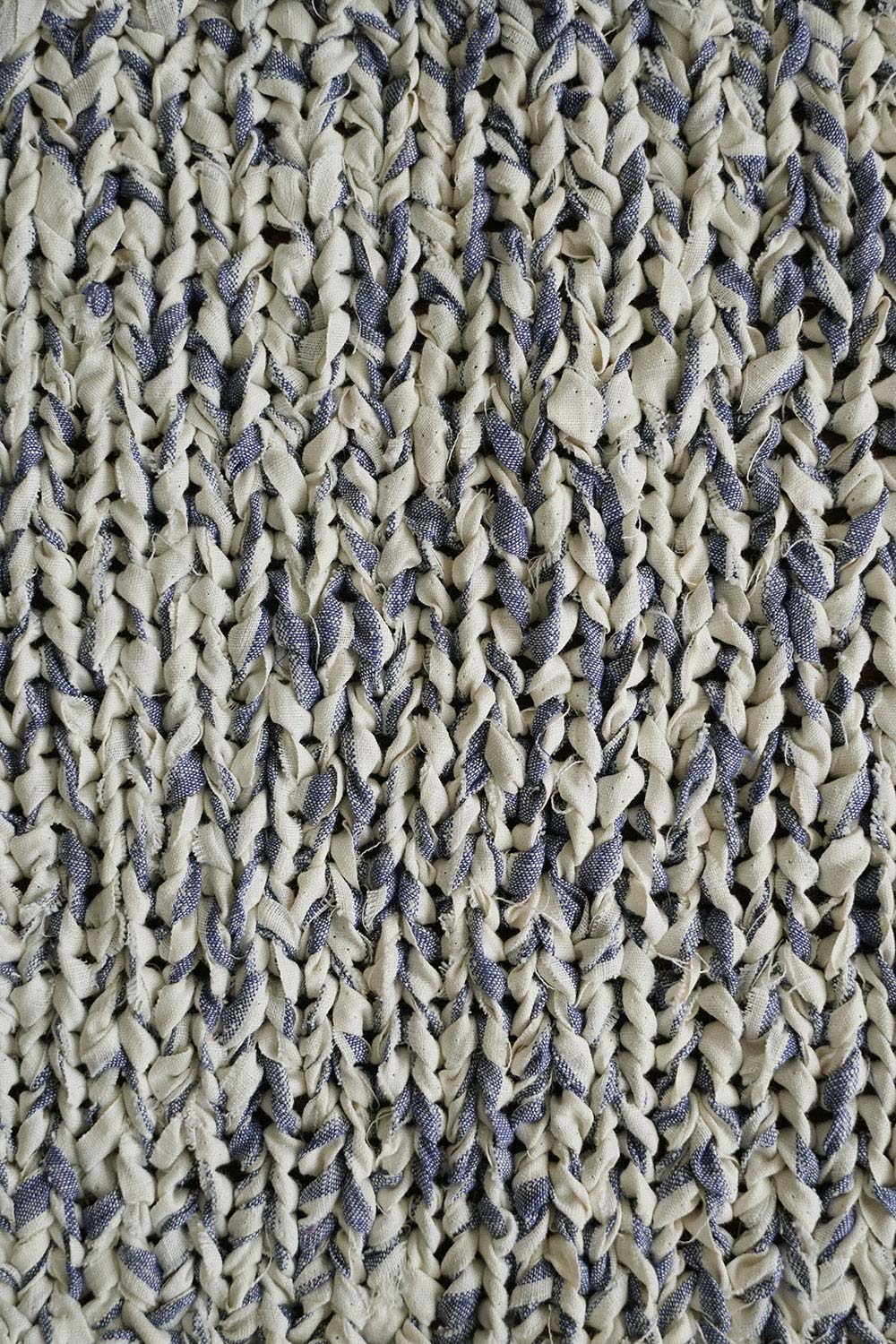 リネン製品のはぎれを使用して編んだニットマット。ざっくりとした厚みのある編地です。