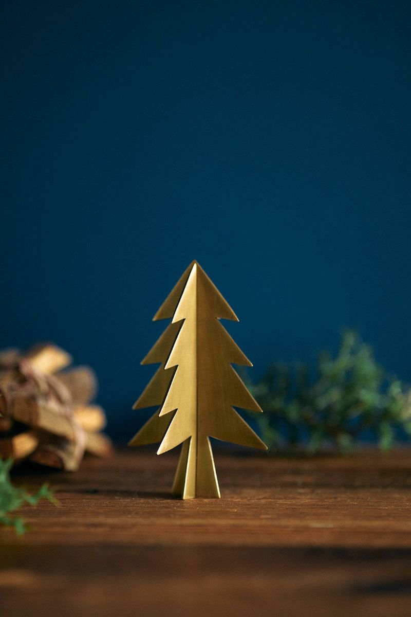 ブラス素材の小さなクリスマスツリー。テーブルや棚の片隅にそっと置くだけで、ホリデー気分も盛り上がります。
