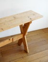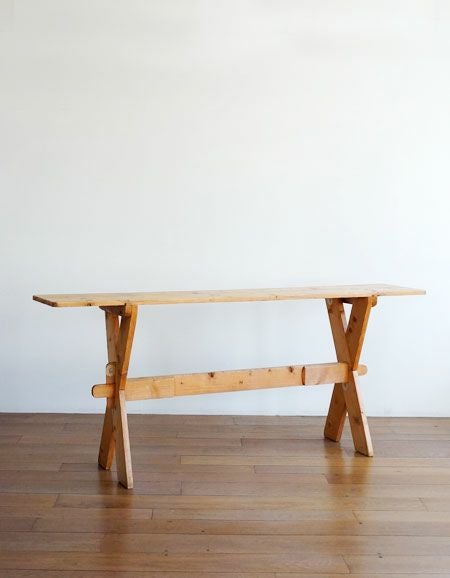 baileysから届いたスウェーデンの組み立て式テーブル。細長い形を生かして、飾り棚や、お店の什器として。使わないときは棚板を外して、足を分解できます。