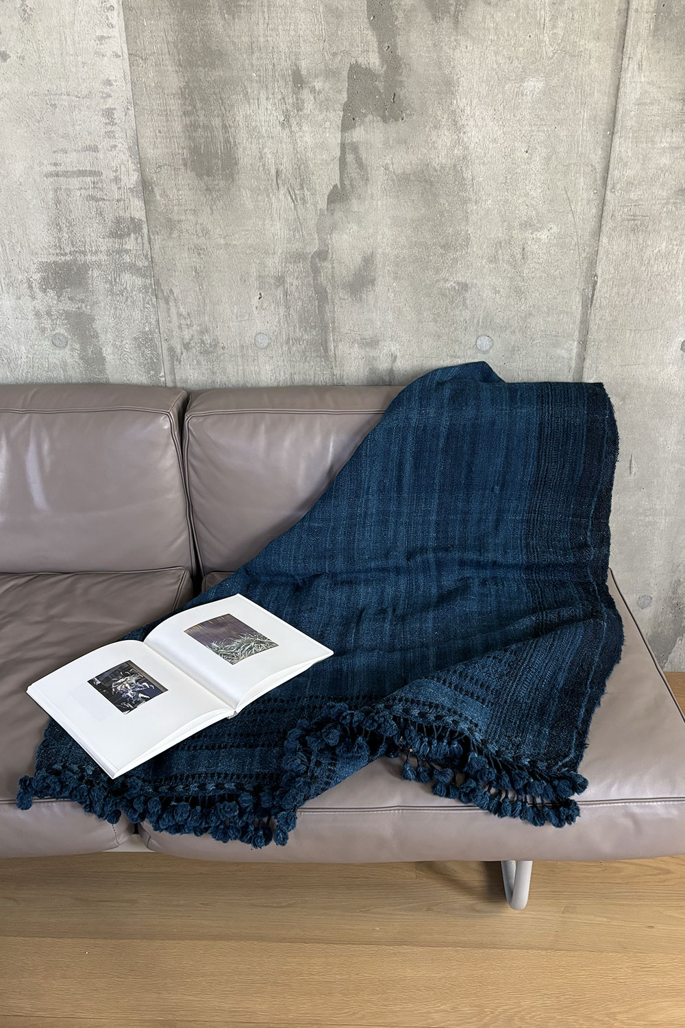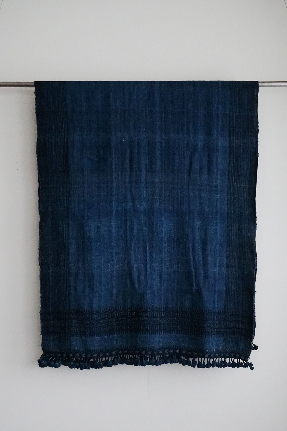 深いインディゴブルーの美しい色合いが魅力です。同じインディゴでも様々な濃さの糸が織り込まれています。