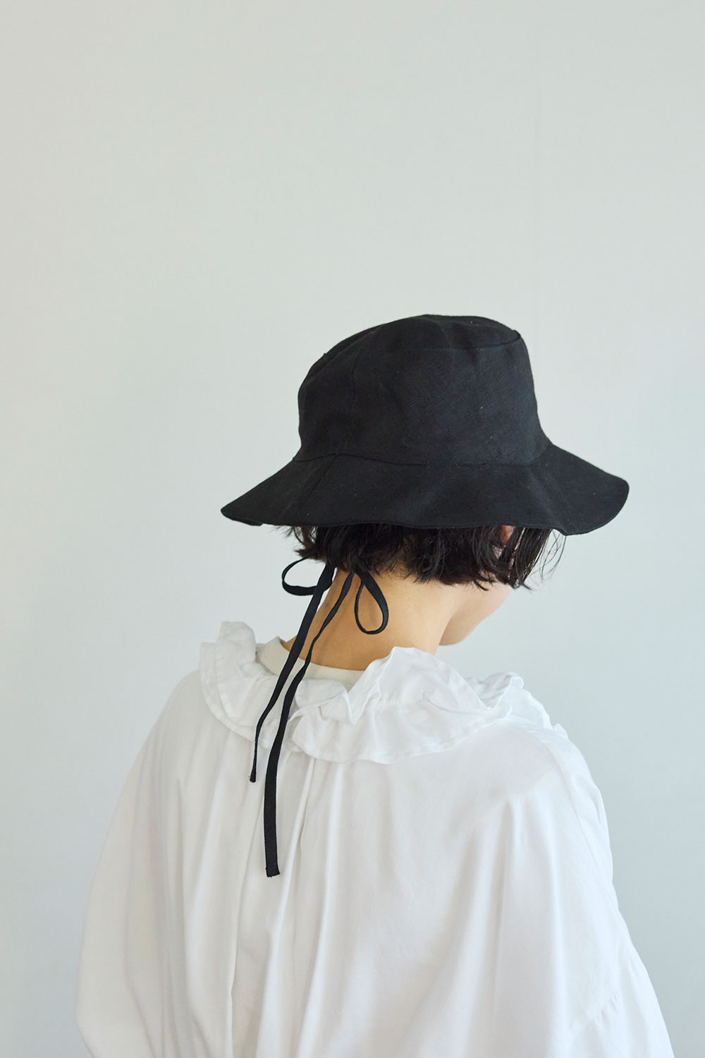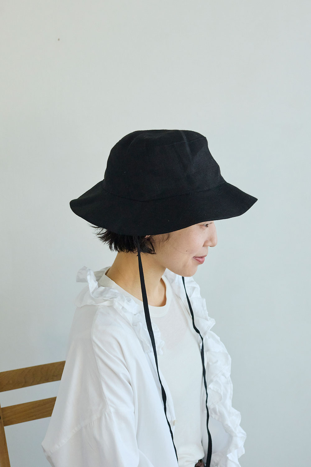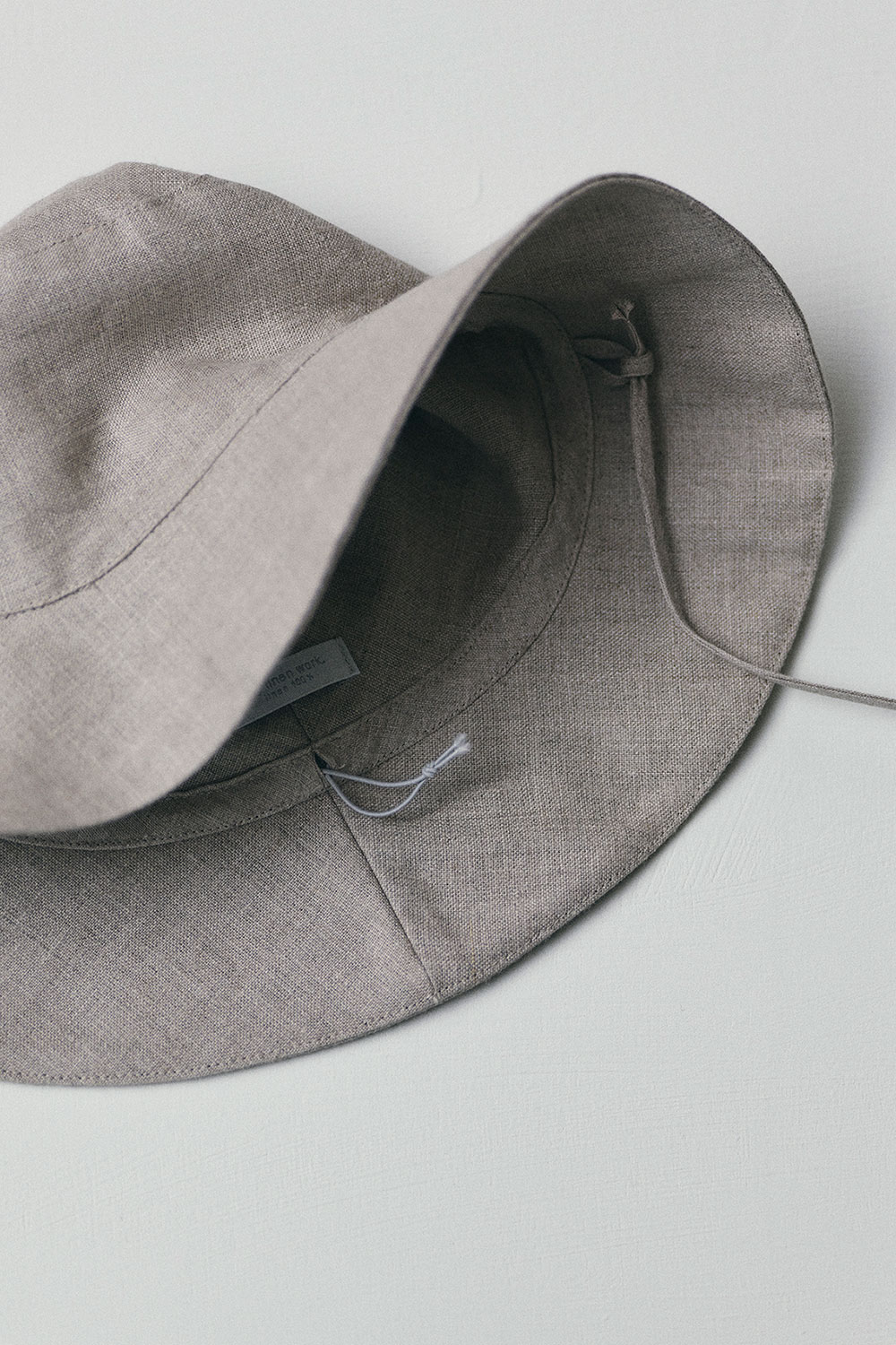 <毎日の装いに、日差しと心地よく付き合う紐付きリネンハット>紐付きのリネンハット。