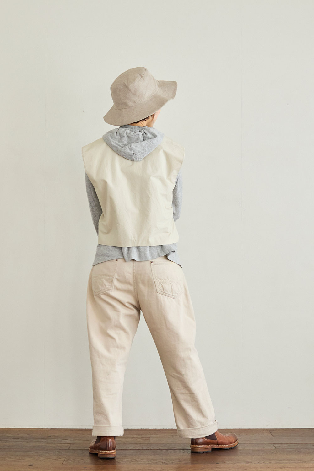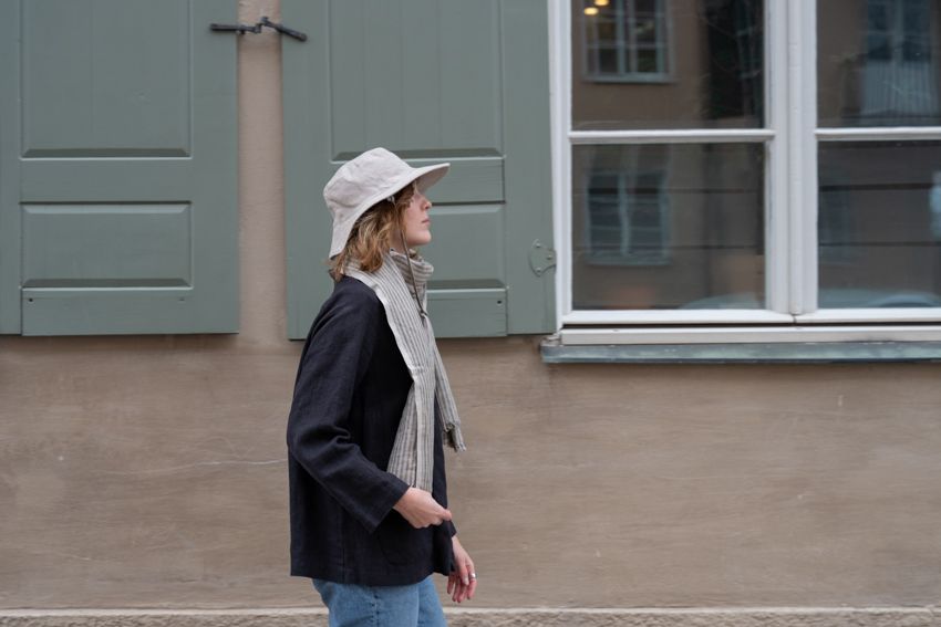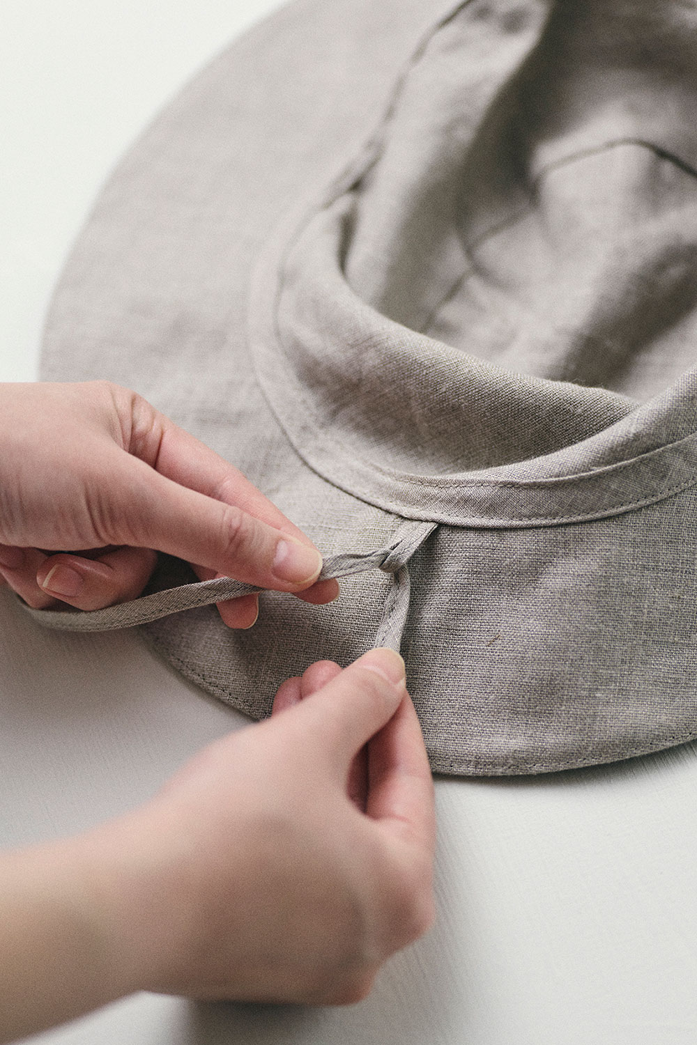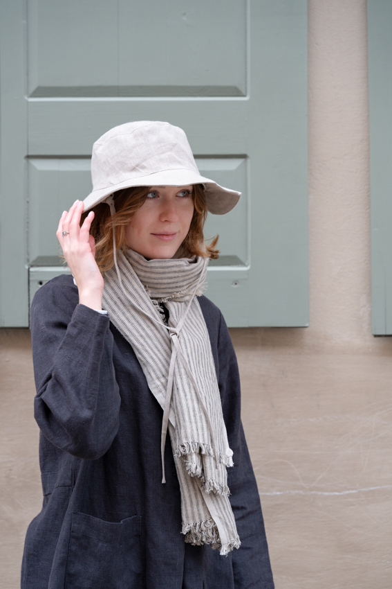 <毎日の装いに、日差しと心地よく付き合う紐付きリネンハット>紐付きのリネンハット。