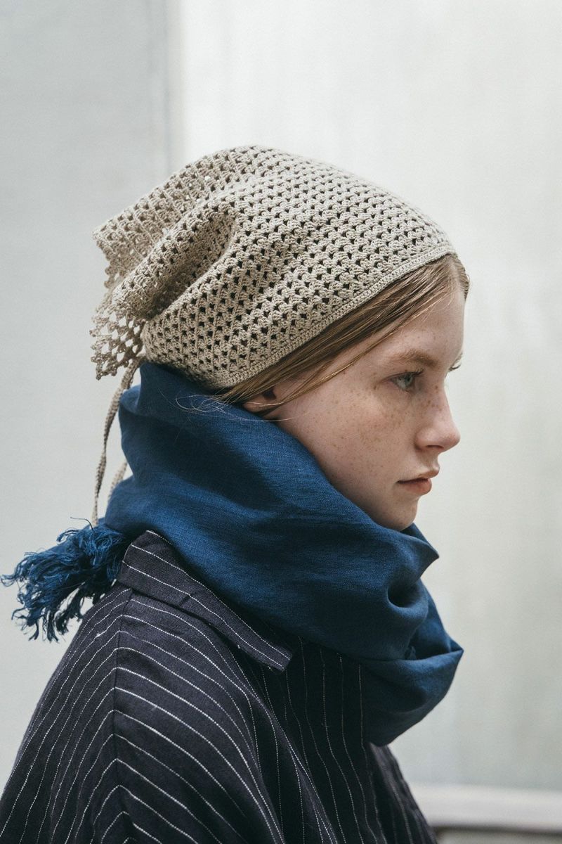<バンダナにもつけ襟風にも。コーディネートのアクセントになるニットスカーフ>リネンの糸で繊細に編まれたニットスカーフ。一点一点リトアニアで手編みされています。