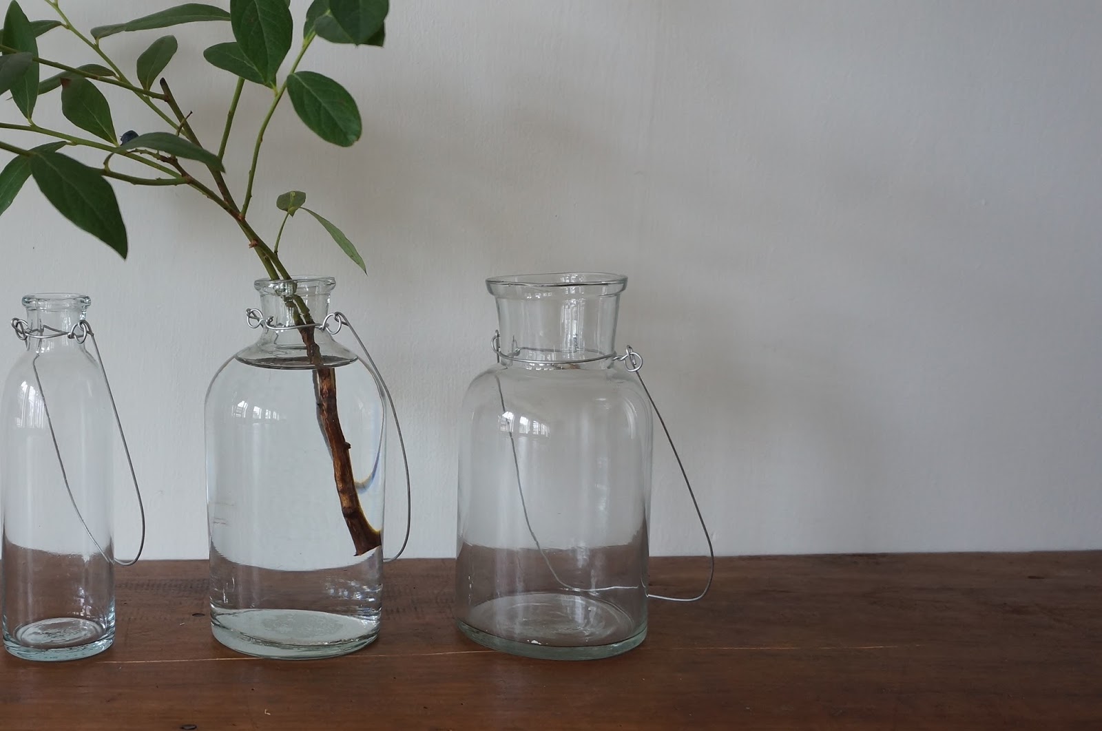 少し厚みのあるガラスにワイヤーのハンドルをつけたフラワーベース