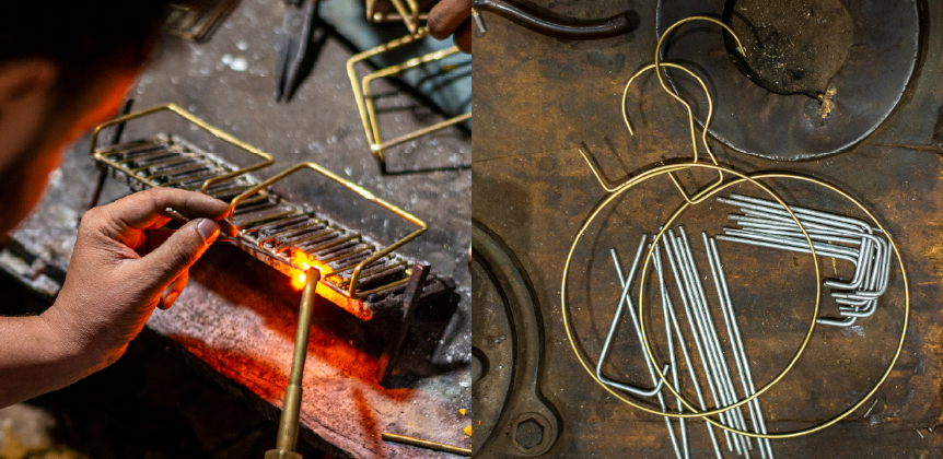 ブラスとアイアン素材で作ったシンプルなデザインのフックや、シェルフ、スタンドなど。