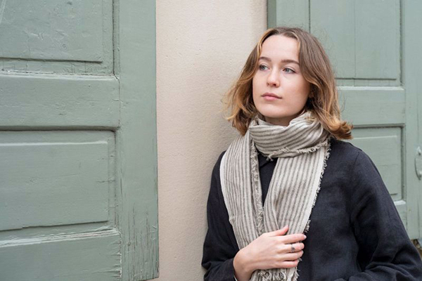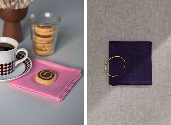 定番のリネンハンカチ、春の新色はフランス語でヒヤシンスを意味する「ジャサント」と、桑の実やブラックベリーを意味する「ミュール」。