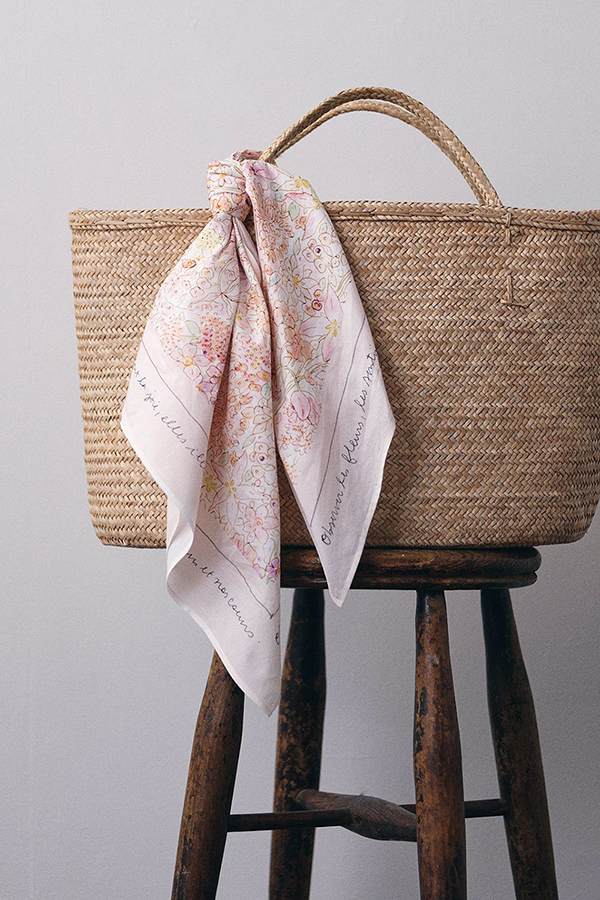 アーティスト、 イザベルボワノさんの優しいタッチで、抱えきれないくらいのたくさんの花が描かれたスカーフ。軽やかで柔らかなコットン素材です。