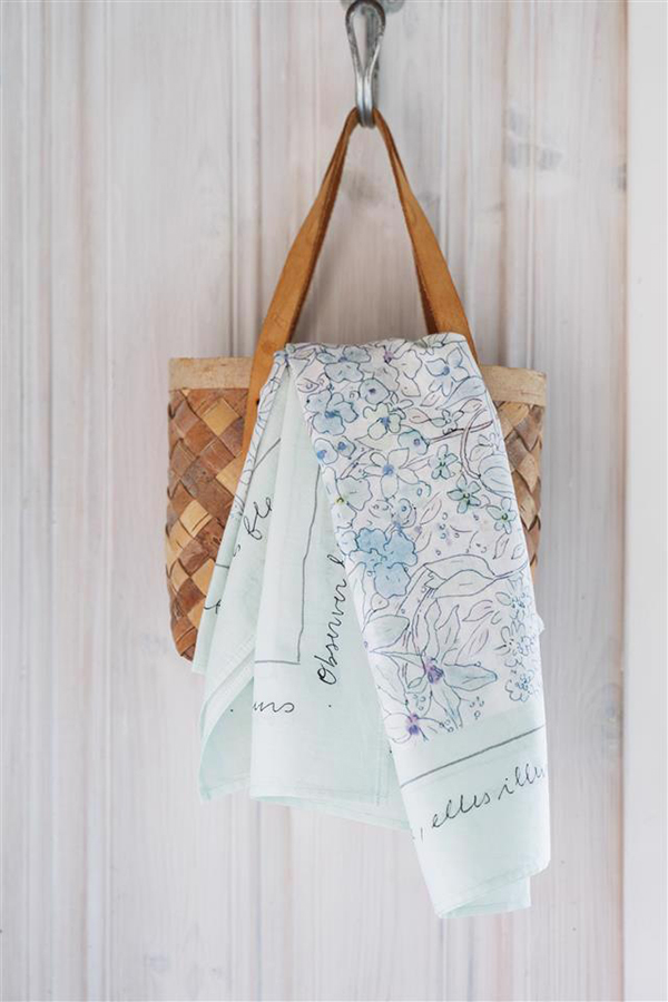スカーフのまわりには、「花を観察し、香りを嗅ぎ、触れてください… 花は喜びであり、私たちの日々と心を明るくしてくれます」というイザベルさんからのメッセージが 。「花はよろこび」というネーミングも素敵ですね。