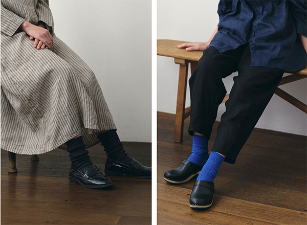 リラックスしたはき心地のミドルゲージリブソックスと、フランス産の細番手のリネン糸で編んだ、繊細な質感のリブソックス。