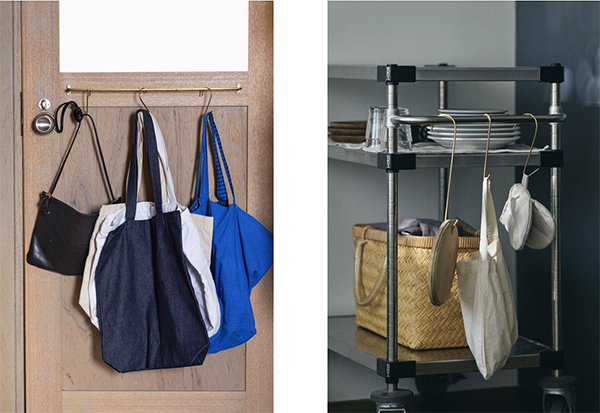 タオルバーに J フックをかけて、たくさんのバッグの収納も。