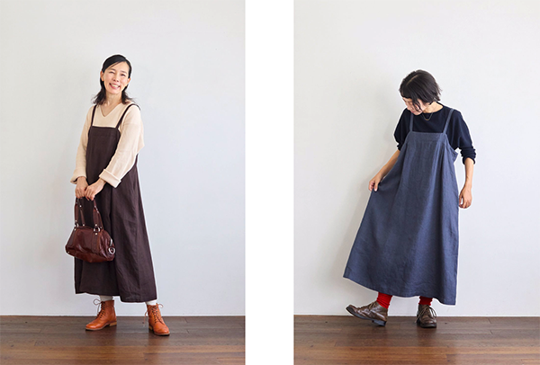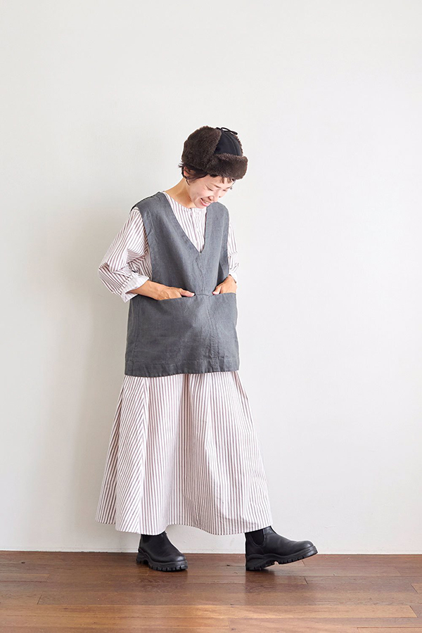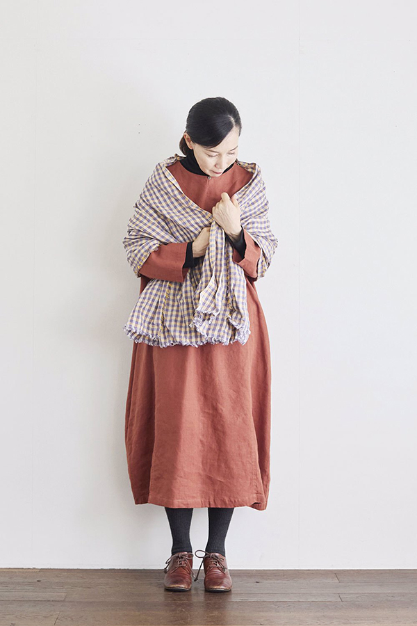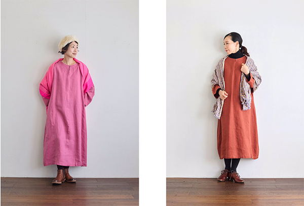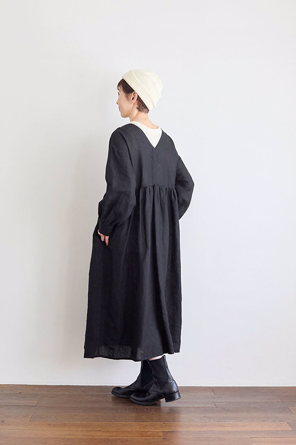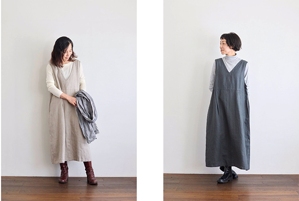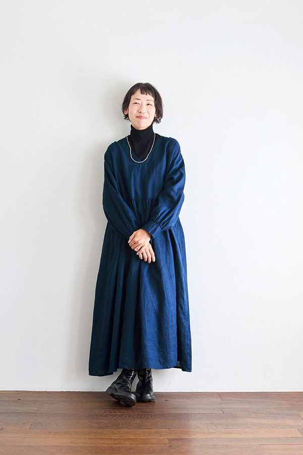「前後の両方で着ることができます。着方で雰囲気が変わるので、その日の気分で着られるのが楽しいワンピースです。今回は V ネック側を前にして、ネックレスをあわせてちょっとドレッシーな印象で着用してみました。身長 153㎝ の私が着用すると足首がすこし見えるくらいの着丈で、ブーツやソックス合わせもかわいいと思います」