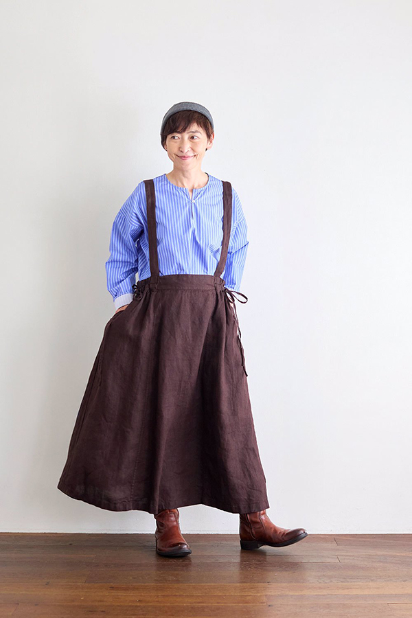 「ストラップ付きのスカートは、楽ちんなのにきれいめに見えるのが気に入っています。ウエストがゴムなのでゆったり着られて、ほどよく広がるシルエットもかわいいですね。ストラップは長さを変えて雰囲気を楽しめるので、その日の気分でアレンジできるのも嬉しいです。今日は一番長くして着用してみました」と Nozomi さん。 サイドについているリボンでウェストの調整もできます。