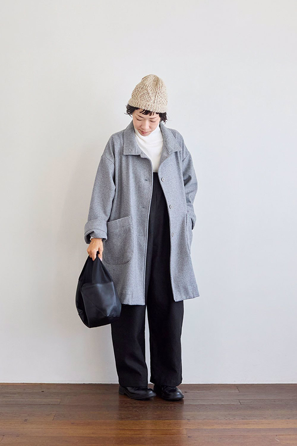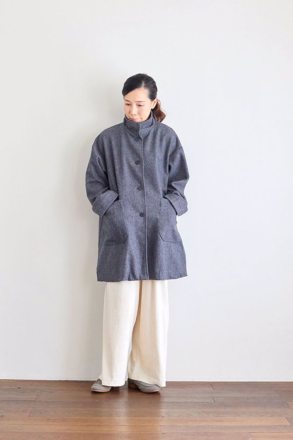 ウールリネンで シンプルなデザインのステンカラーコートも作りました。