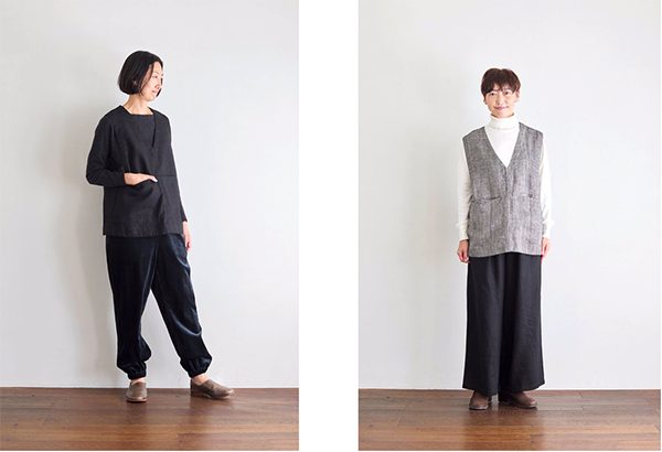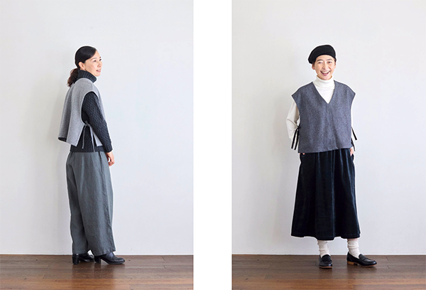 どちらもモノトーンでまとめているけれど、パンツとスカートでは印象が違います。「ニットの上から着てもサイドが開いているので、窮屈な感じはありません。