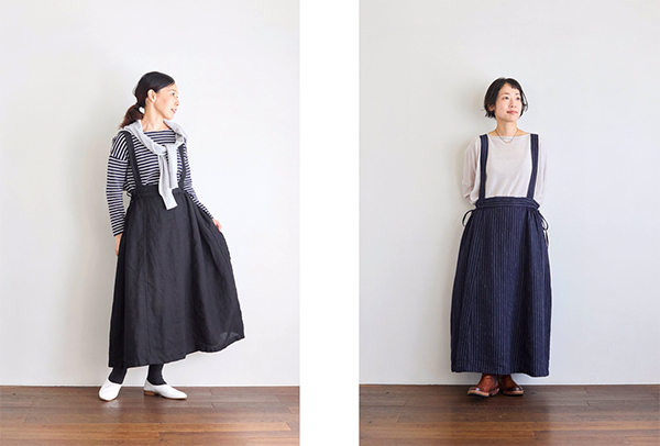 シルエットのきれいなジャンパースカートは前後で V ネックの深さが違うので、その日に合わせるインナーや気分でお好きな方を前にして着ることができます。