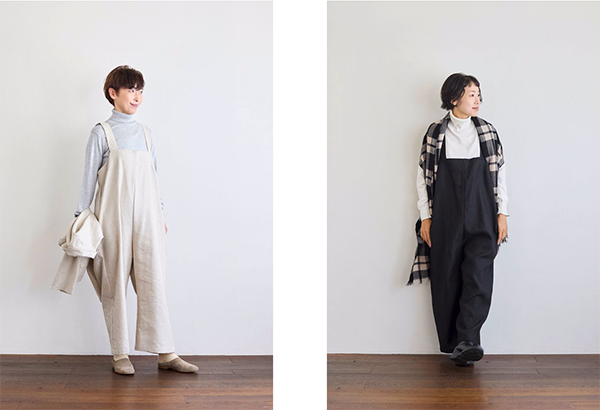 シワが目立ちにくいので、カジュアルにみえがちなサロペットもきれいめに着られます。