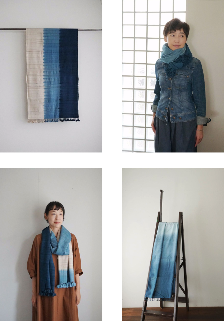 美しいインディゴのスカーフは、 上質なコットンやウール、シルクの糸を紡ぎ、天然染料で染め、1 枚 1 枚丁寧に織り上げたもの。