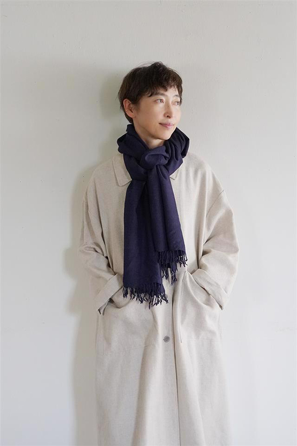 先週ご紹介したニットスカーフをさらりと巻いて。