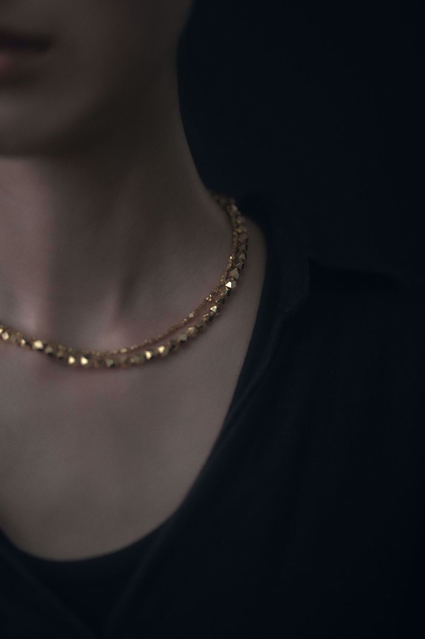 小さなビーズを等間隔に配置したアイシャ ネックレスと、中央にブラスビーズを配置したラービア ネックレス。