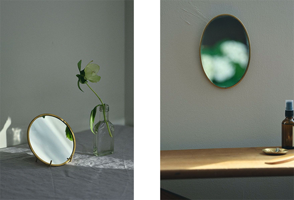 美しいブラスのミラーが部屋の中にひとつあると、光を反射して素敵なシーンが生まれます。ピアスをつけたり、メイクをチェックしたり。デザインは円形、スクェア、オーバルの 3 種類をご用意しています。
