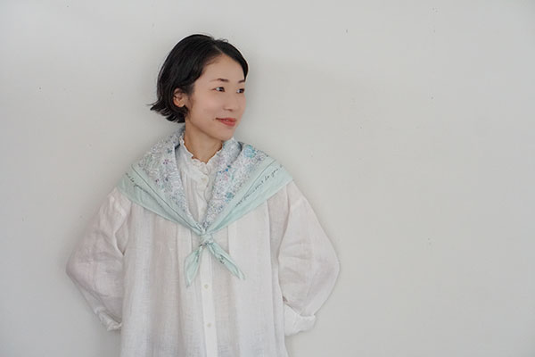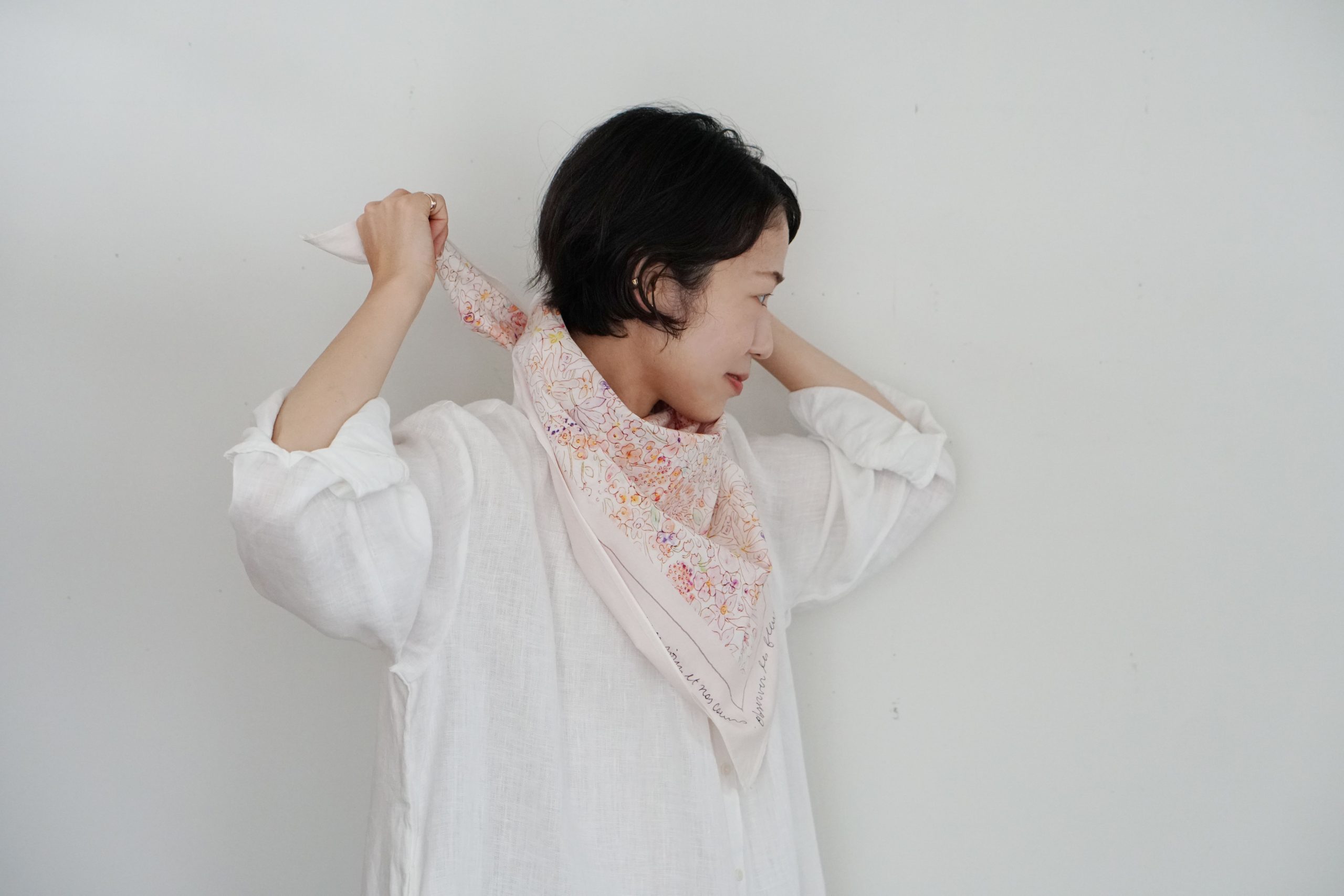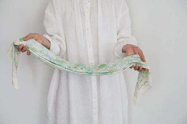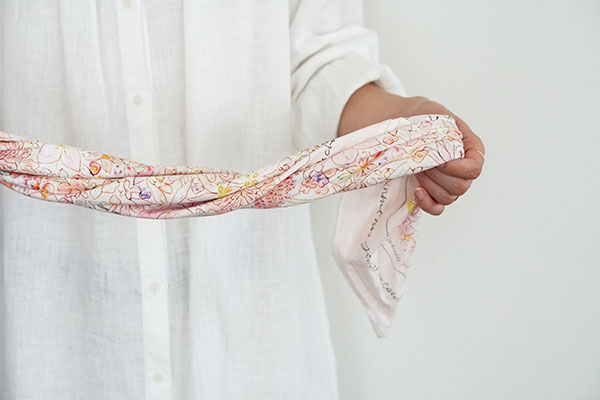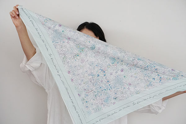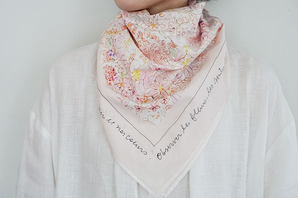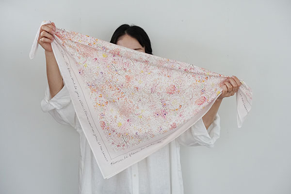 イザベルさんがデザインした優しい絵柄のスカーフ